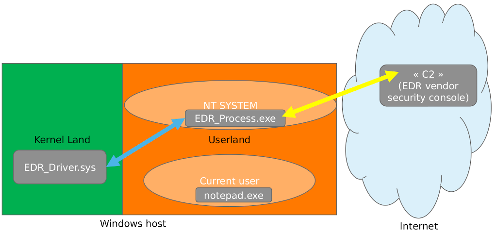 Now before digging into internal communication, I want to take a step back and simplify the EDR behaviour. Internal communication (blue arrows) and external communication (yellow arrows) of the EDR_Process.exe could be visualised with a simple overview: