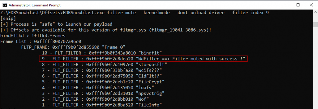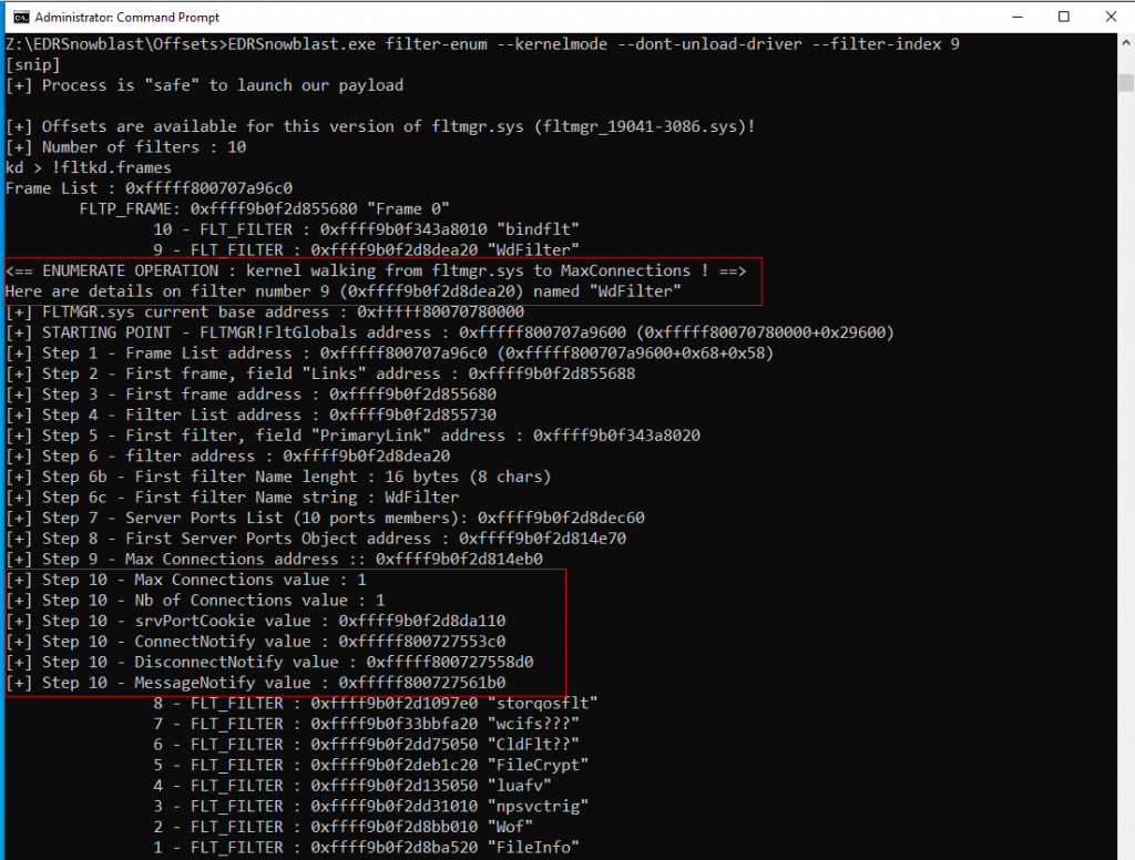 EDRSnowblast.exe filter-enum --kernelmode --filter-index 9