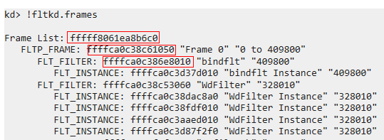 Ok nice we can verify and visualize where we are using Windbg filter kernel debugger (fltkd) command named frames: