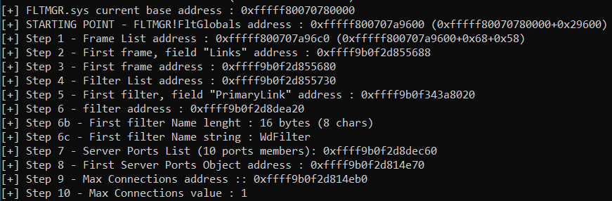 The structure fltmgr!_FLT_SERVER_PORT_OBJECT we discussed previously could be reached by the structure fltmgr!_FLT_FILTER, which could be reached by the structure fltmgr!_FLTP_FRAME, which could be reached by the structure FLTMGR!_GLOBALS, which could be reached by the FltMgr.sys driver. The base address of this kernel module can be retrieved from userland using NtQuerySystemInformation Windows API.