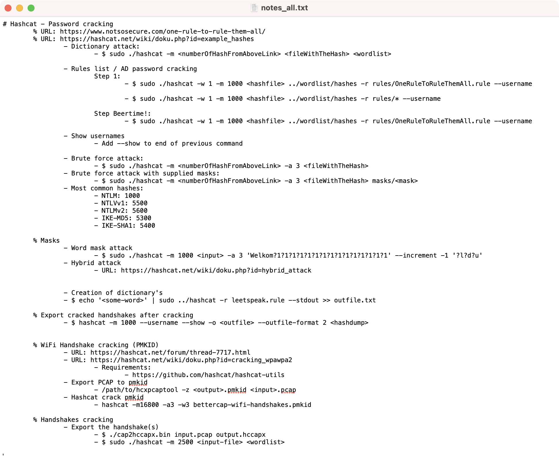 The contents of notes_all.txt were all migrated to what is now known as the Knowledge Base – aka kb.offsec.nl / https://github.com/crypt0rr/kb. This Hugo based website is built with a CI/CD pipeline via GitHub to CloudFlare Pages where it is hosted as well. Feel free to contribute!