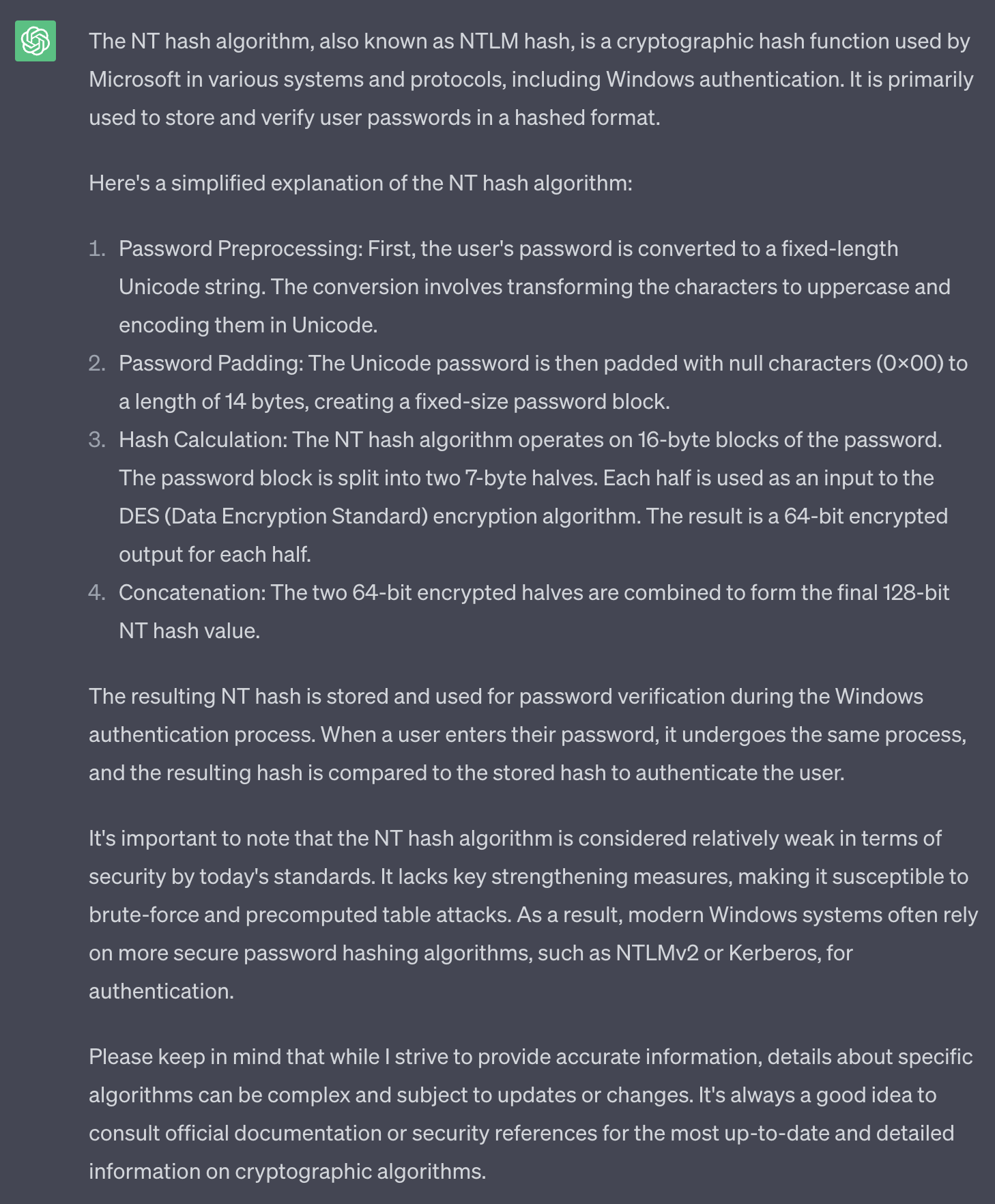 I also asked ChatGPT to explain what an NT hash is, below is the explanation I received.