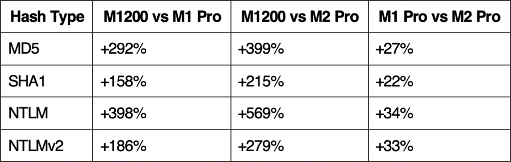Let’s take some commonly used hash types to compare. Note, the M1200 used about 55W from the wall during benchmarking, and the M1 Pro used about 25W.