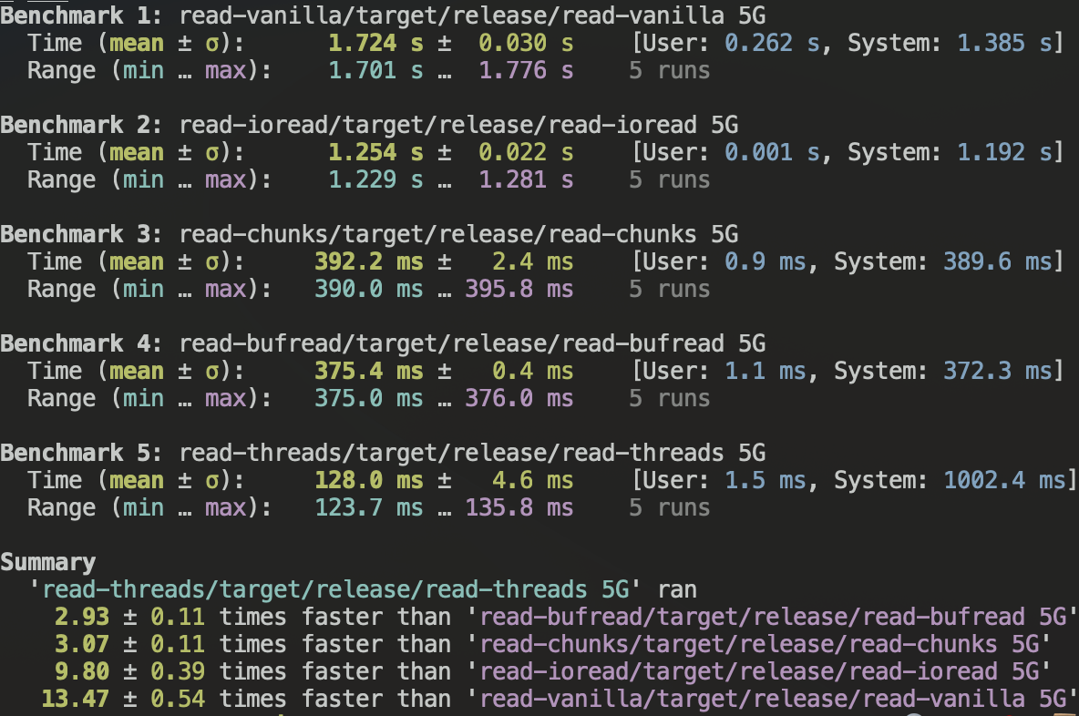 I’m quite simply measuring total execution time of each version when reading a 5G file. I do this using the fantastic hyperfine tool.