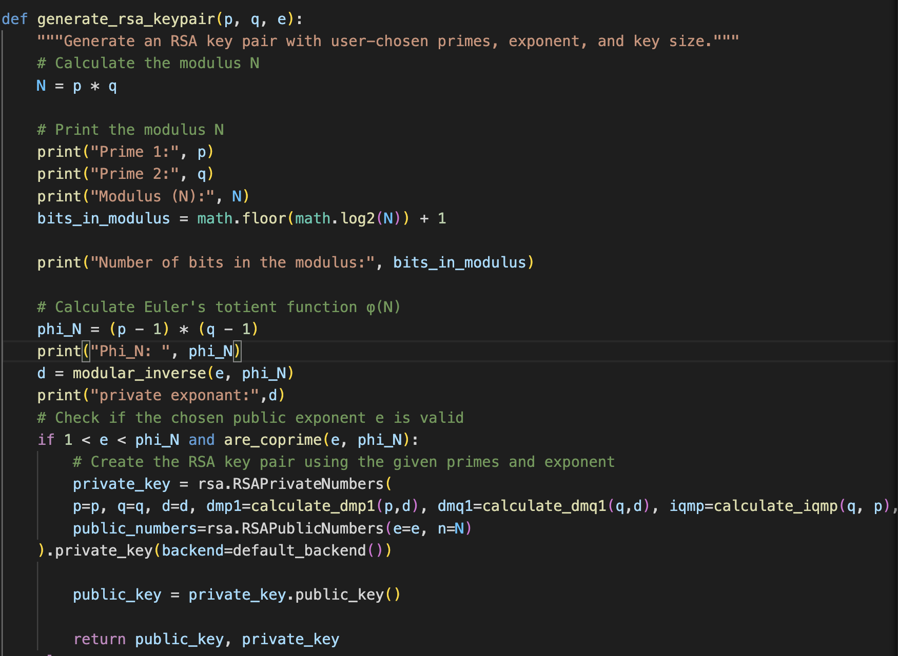 In order to get two prime numbers I chose two “small” prime numbers found a random number between those and used SymPy’s nextprime function to find the next available prime number. This allowed me to generate different keys each time I would want to create a set of keys while also creating weak RSA keys that was big enough to encrypt the data.