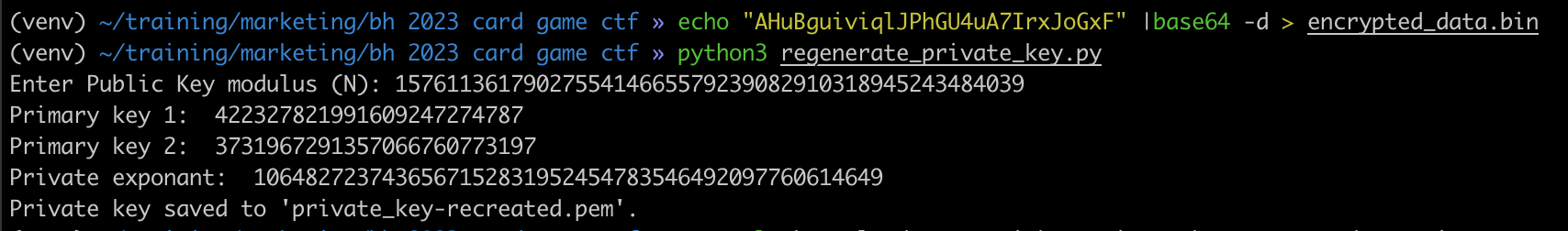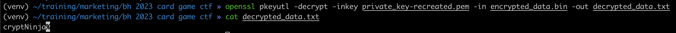 From there it’s as simple as recreating the decryption key and regenerating a private key to decrypt the garbage hidden in the base64 encoded string. Simplified, that will look something like this: