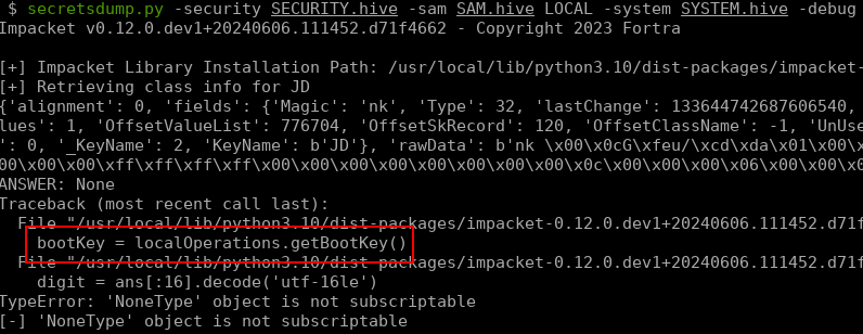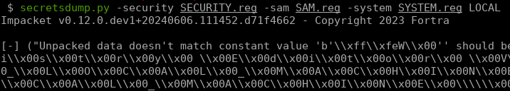 We have the values we are looking for, but if you pass these files to secretsdump, it will crash: