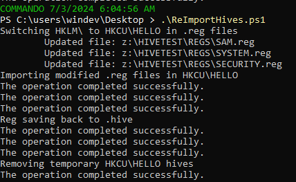 At this point, my idea was simple. If I have got the reg export results in a text format, I can just import them in a Windows VM I own then reg save them and run secretsdump. So I wrote a PowerShell script to do that: