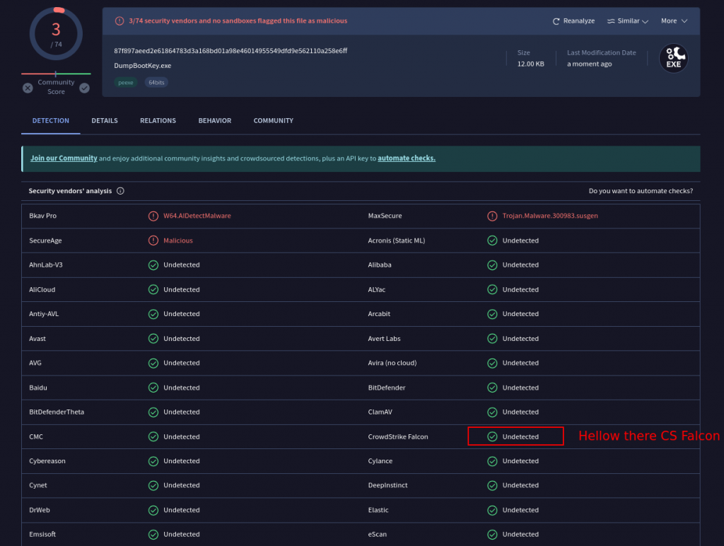 Two things are important with this binary. First you don’t need NT SYSTEM privileges to get the values (which is a pretty huge prerequisite). Second, you may think that reading these values is flagged/blocked by AV/EDRs… But it’s not: