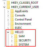 reg save HKEY_CURRENT_USER\HELLO\SAM Z:\HIVETEST\DC\SAM.hive