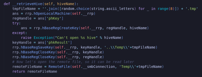 Taking a look at the code, we can see that NetExec is saving the registry hives to the disk. The interesting code is located in the file nxc/protocols/smb.py: