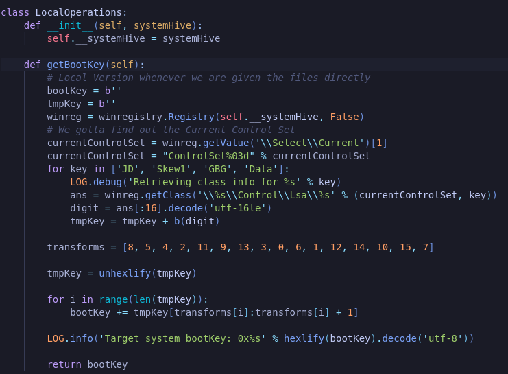 And I naively thought that these were the values used to compute the boot key until I found out, after digging in the secretsdump code that it was not. Indeed, if we take a look again at the getBootKey function we will see that it does not do a getValue() call but a getClass() call: