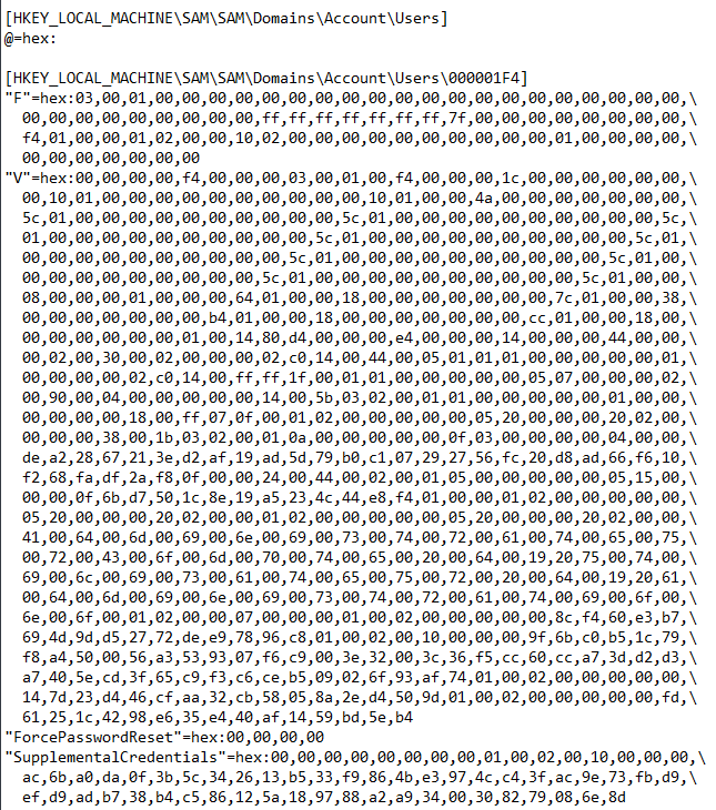 Which means I was able to retrieve the content of the SAM, SECURITY and SYSTEM hives without triggering the EDR. However, reg export results are not like reg save results. Reg export files are text files which contain the registry keys and their values. For example, if we take a look at the export of the SAM hive, we’ll have the following result: