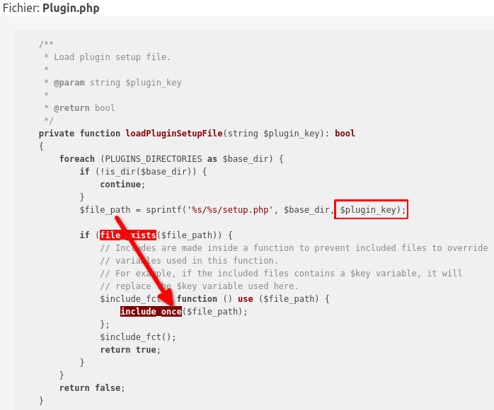 All of this information is important because we know that a plugin has CRUD methods. Theoretically, we can Create a plugin, as the Plugin class has a create method (CommonDBTM::add). Again, always follow your intuition! Moreover in GLPI, plugins are identified by a $plugin_key that refers to the directory where the plugin is installed. By looking at the code we quickly understand that by controlling this path, Local File Inclusion (LFI) could be achieved, and arbitrary code could be executed on the target.