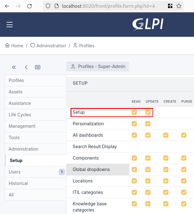As shown above, the Setup row (which correspond to the config rightname is locked for any other rights than Read and Update). But because we already saw a Mass Assignment vulnerability in GLPI, why not try it again. Moreover here is the code responsible for updating profile rights (again update with a Superglobal):