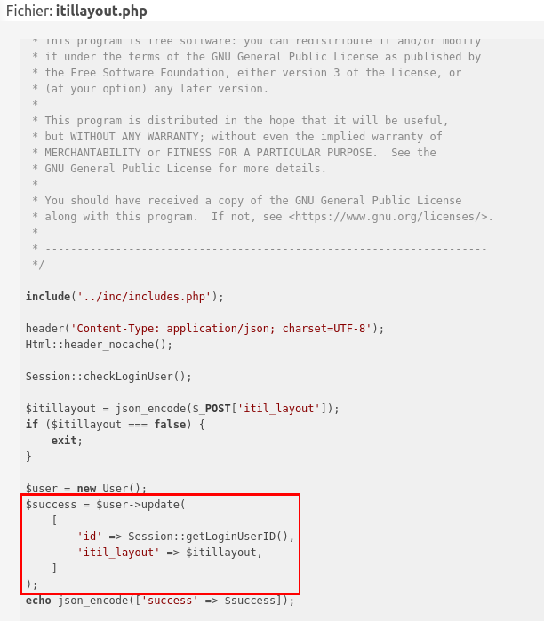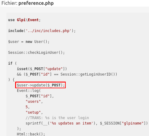 Luckily for me, when I reported a vulnerability on GLPI in the past, another person (Abdulmohsen Alotaibi) reported one at almost the same time, see: https://huntr.com/bounties/82443f1f-300b-4d5a-a1ab-73902263ea4b. In fact, at the time I was studying for the OSWE exam, and so, I checked a lot of public vulnerabilities to improve my code understanding. And this one was interesting. By checking the code, I found what I needed for building the kill chain!