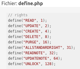 The different rights on GLPI are stored in the database in the table glpi_profilerights: