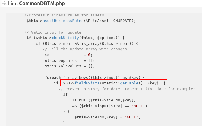 The patch here adds a check on the $_POST variable, that could have been altered. When I saw this, I knew the patch worked (or at least it seems), but there is still SQL injection! In fact the SQL injection was not only in the $_POST variable, if we look carefully, we can see that the attack is also possible through the $_SESSION variable. However, it seems that the $_SESSION variable cannot be updated directly. Now let’s deep dive into the GLPI CRUD operations.