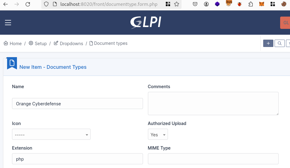 Now we just have to allow PHP upload, and upload our web shell to achieve RCE. For this just go to the documenttype form and allow the PHP upload: