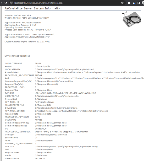 Let’s have a look at what could be important. Based on this information we know that the application runs on the system drive (C:). This is useful to know for command execution payloads or Local File Inclusion (LFI) vulnerabilities. The process is running as ‘NT AUTHORITY\SYSTEM’, which is a local account with the highest privileges. We also now know where ReCrystallize Server is installed and therefore would be able to find out where files are going to be stored. In this example you are also able to see that the server is domain joined (no this is not a client domain as I made an effort to set up a lab environment).