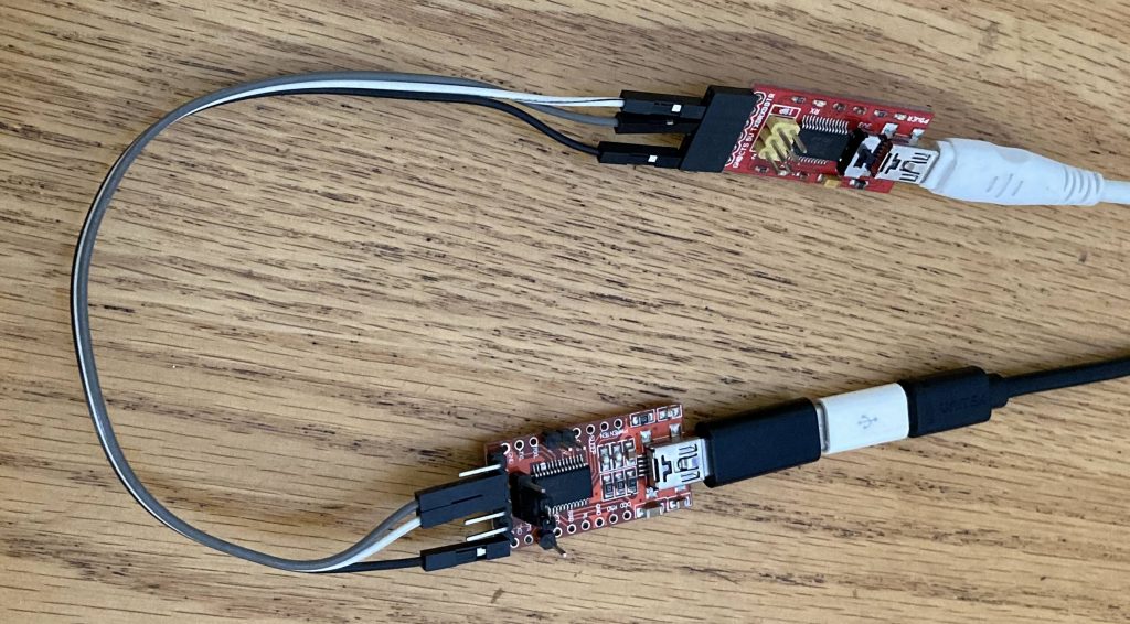 Can we turn this into a fully featured PitM? Yes, with a caveat. By disconnecting the header pins between the RX and TX pins, and connecting those in crossover form to the two USB-RS232 dongles, we can end up with a full PitM. As before, we can use the same socat command line as the first scenario to record the data.