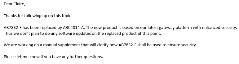 - 2023-10-12 : Notice from HMS Networks: As the gateway AB7832-F replaced by new product ABC4014-A, the mitigation will only consist on a manual supplement to clarify how AB7832-F shall be used to ensure security.