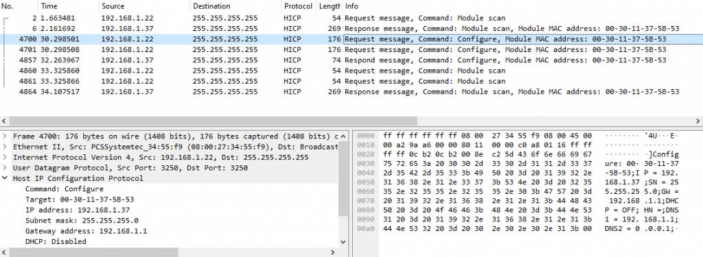 Capturing the traffic while using it, we observe that the requests are being sent to the port 3250/udp that we saw previously, using the protocol HICP. This is a proprietary protocol by HMS Networks primarily intended for devices’ IP network configuration. It is unencrypted, and supports authentication by setting a password, but authentication is disabled by default (by the way, I have never seen it enabled in real life). This means, at least, that: