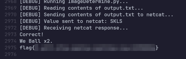 So with the 1:1 match, what’s left to do is have the script send the values of each split image to netcat and repeat the process 200 times, while, of course, combining the image results in a single four character code.