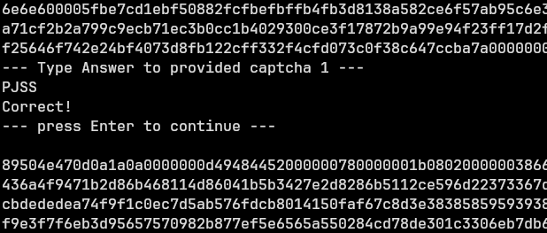 What’s happening? We connect to the instance using netcat, thereafter; the prompt states to solve the CAPTCHA 200 consecutive time in order for the flag to be given. The image is given in hexadecimal format. Viewing the image: