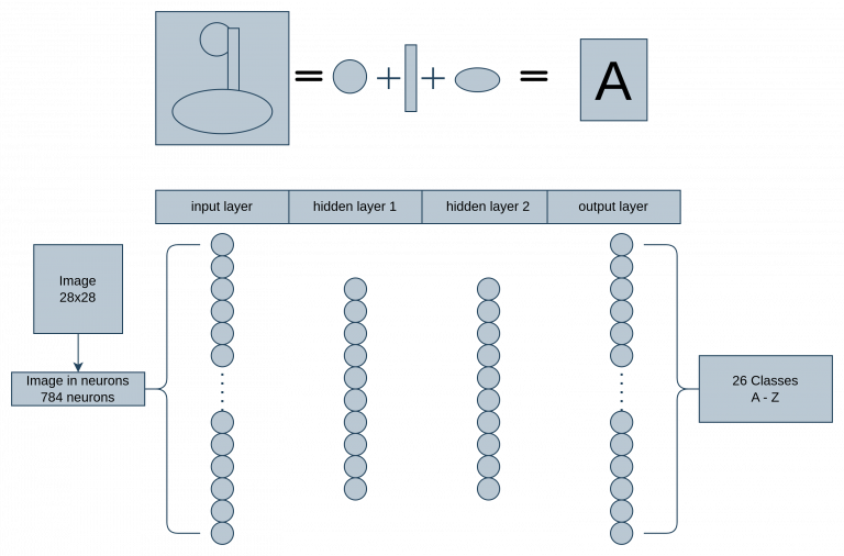 Perspective; 784 neurons, 16×2 hidden layer neurons to an output layer of 26 classes. This is also simplified to the extreme. In reality this would have multiple connections for a single image to class and the connection weights will also play a factor (The lines are the connection weights and each line will have a value).