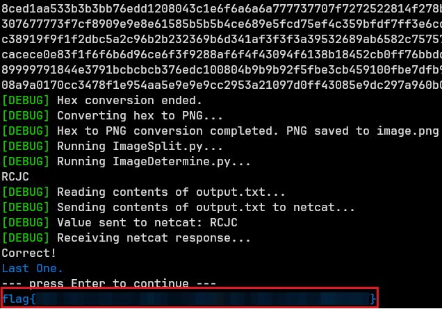 Enough yapping and let me show you what I did. I could recycle the script to connect to netcat, get the hex and change to images of four. Then finally sent it back. Now all we need to focus on is determining the symbol values.