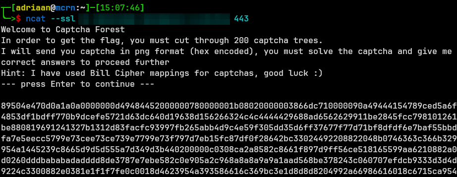From this, we can see that my terminal is cool and can display images, but also that the CAPTCHA is some sick joke of a hieroglyphic. Luckily the prompt was generous enough to provide the mappings as Bill Cipher, from Gravity Falls, substitution cipher.