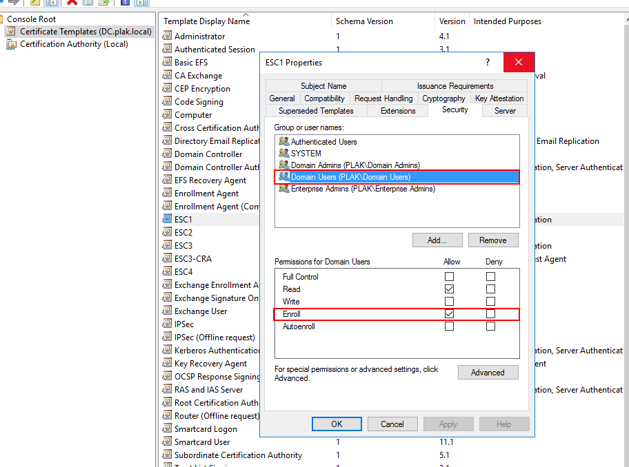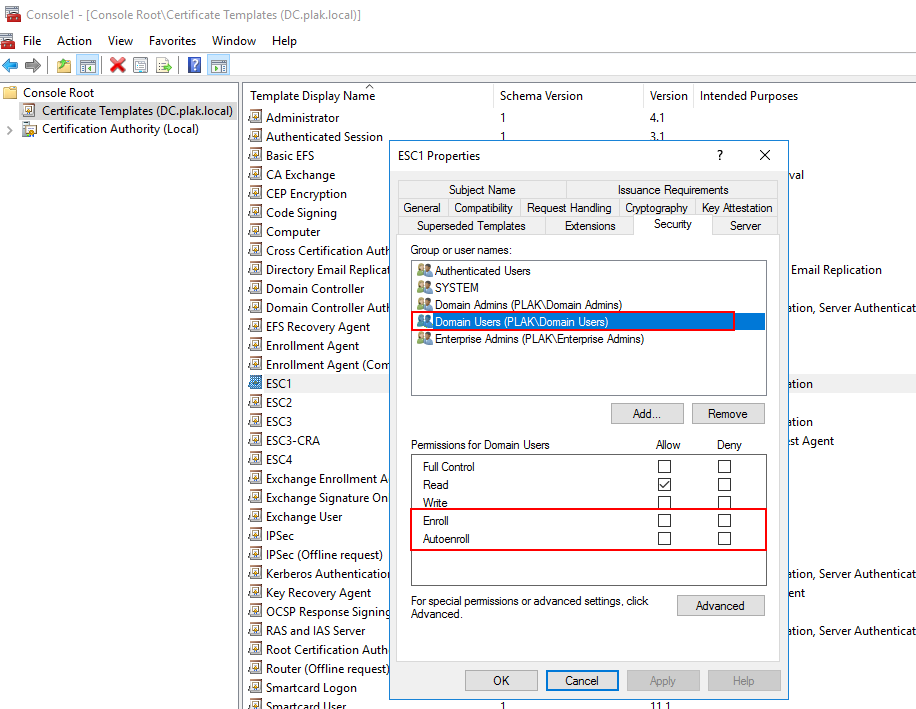 In the case above, the ESC1 certificate template’s permissions were modified to disallow enrollment as follows: