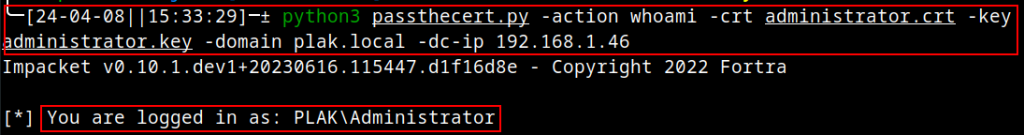 The question now turns to what happens when we attempt authentication against the Domain Controller with the issued certificate? In the below scenario, we are opting to use the certificate to authenticate against the Domain Administrator account (PLAK\administrator). This would classify as a valid client authentication attempt for the issued certificate. As such, we can get a valid TGT for the domain account and get its associated NTLM hash.