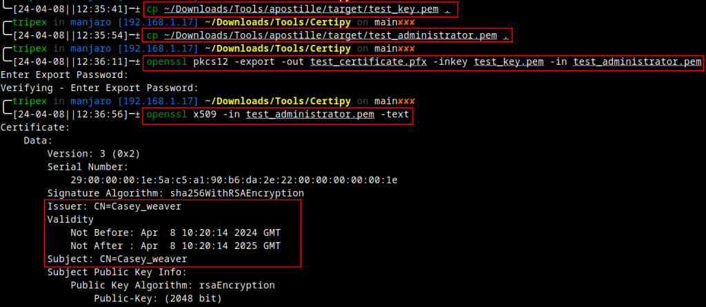 With the cloned certificate generated, we convert the PEM formatted certificate and key back to a PFX using OpenSSL: