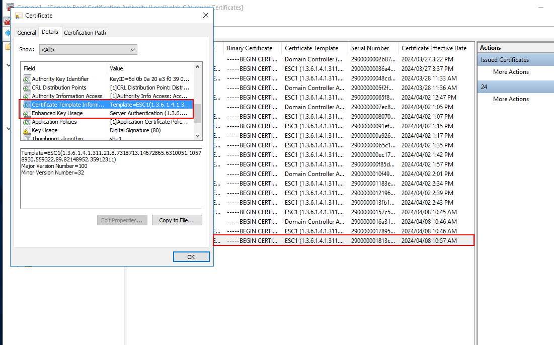 On April 8th, I requested the AD CS service to issue a new certificate based on the ESC1 certificate template: