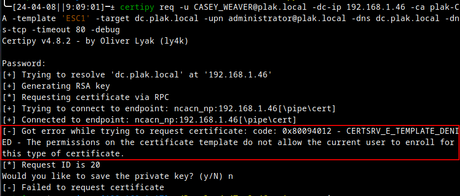 Error messages regarding the second step are also quite verbose in the latest version of certipy. The tooling was updated recently to indicate that the template disallowed the certificate to be requested:
