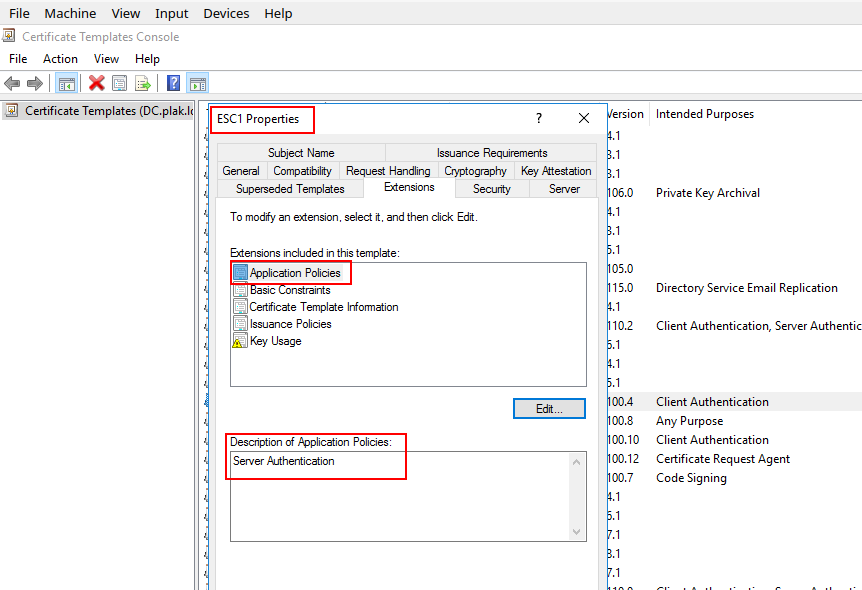 It is important to note that the certificate template (ESC1) has been configured for client authentication only: