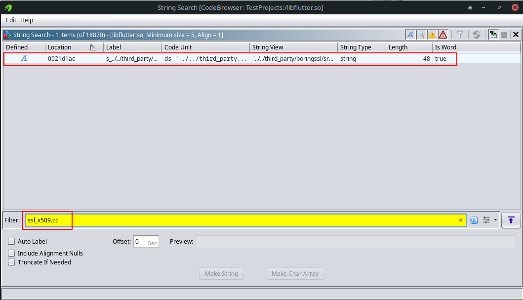 Unfortunately, identifying the function turned into quite the exercise. Remember the libflutter.so file is stripped, which means no symbols are available. For example, this is the output Ghidra showed when navigating to a cross-reference of the ssl_x509.cc file:
