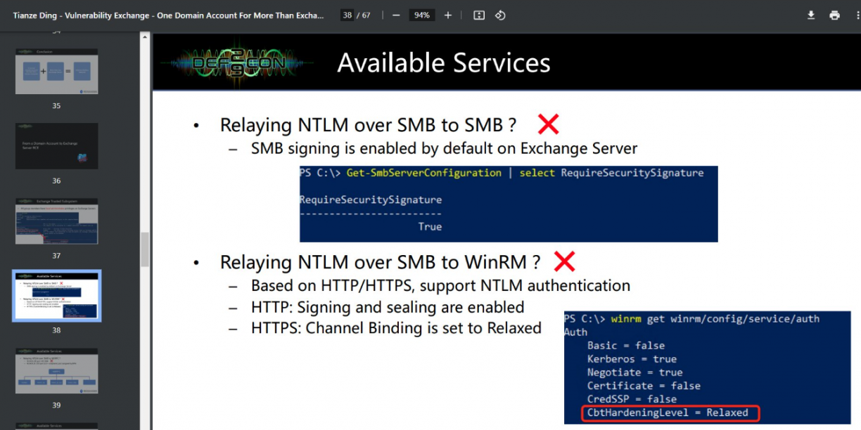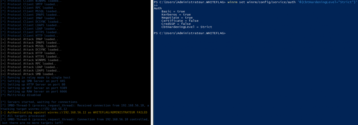 This is quite interesting because the paper says that relay to WinRMS should not work, even thought it also says that Channel Binding (CBT) is set to “Relaxed” in the WinRM configuration. However, Channel Binding, which is used to protect NTLM authentication by binding it to a TLS session, can be configured with one of the following three values: