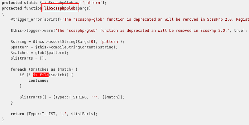 There is a function named libScssphpGlob! As you might know, glob is a reference to the globbing mechanism on linux, and it is usually used in order to list files or directories using a pattern. Let’s take a look at the code for this function: