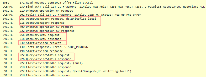Then PsExec.exe, the client, connects remotely to the SVCCTL RPC endpoint which is used to manage services and calls 4 interfaces: